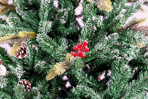 Designed with frosted tips, pine cones and red berries for elegant looks. For indoor use only include Green metal stand flame retardant, easy to assemble. order quantity: 1 pcs