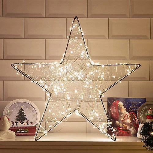 - 50CM LIGHT UP CHRISTMAS STAR: Add a magical glow to your home at Christmas with this Light Up Star Decoration. The star measures 50cm and features a silver metal frame which is illuminated by 100 micro LED bulbs. It has a freestanding design and looks fantastic as a centrepiece on a shelf, windowsill, mantlepiece, or coffee table.