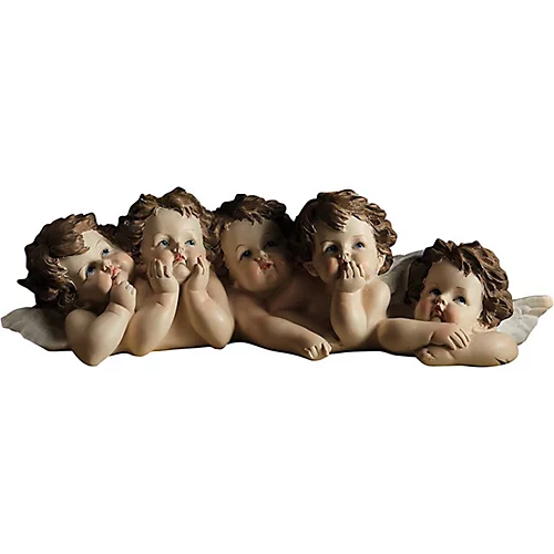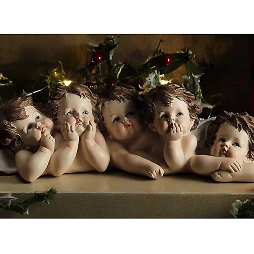 Whimsical waiting Cherubs. A witty and wonderful Christmas ornament, this line-up of 5 expectant angels is designed to sit on a shelf or mantelpiece. Polyresin with hand-coloured details Measures H8 x W27 x D9cm