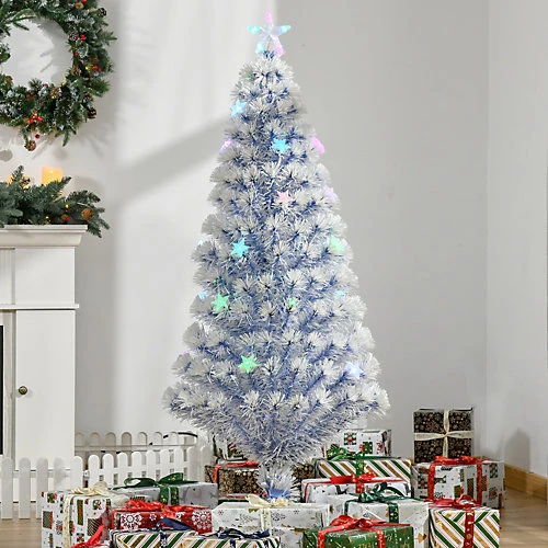 - • Item Name: Artificial Christmas Tree • Brand name: HOMCOM • Colours: White/Blue Tree, Multi-Colour Fiber Optics/ LEDs • Materials: PVC Branches, Metal Base • Overall Dimension:Φ64 x 150Hcm • Tree Height (Including Star and Stand): 1.5m Tall • Tip Count: 180 Branches • Light Count: 21 LED Lights • Net Weight: 3.8kg • Flat Pack: Yes • Custom Label: 830-242
