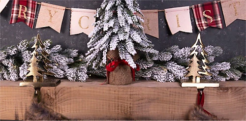 A set of 2 charming weighted christmas stocking holders with a Christmas tree design. The holders make a lovely festive decoration which can be placed on fireplaces, window ledges and shelves, simply hang your stockings on the hook and wait for Father Christmas to arrive. The perfect alternative to hammering nails and hooks into your walls.