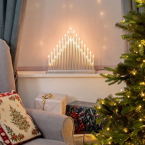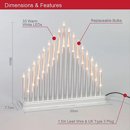 This modern and bold looking sliver finished Christmas candle bridge is an iconic festive ornament, and will become a prominent show stopping Christmas decoration in your house this year! This candle bridge is so unique that it utilises 33 individual warm white LED candle lights to make it look like real candles are flickering away when the power is turned on. The candle bridge is mains powered, and the 33 individual light bulbs are replaceable, meaning if any diminish in luminosity over the years then they can be simply changed out, keeping the festive glow bright and strong for many years to come. The candle bridge measures 33cm x 36cm, (W x H), making it a fantastic size to sit atop of the fireplace, in the window, or on the dining room table this Christmastime.